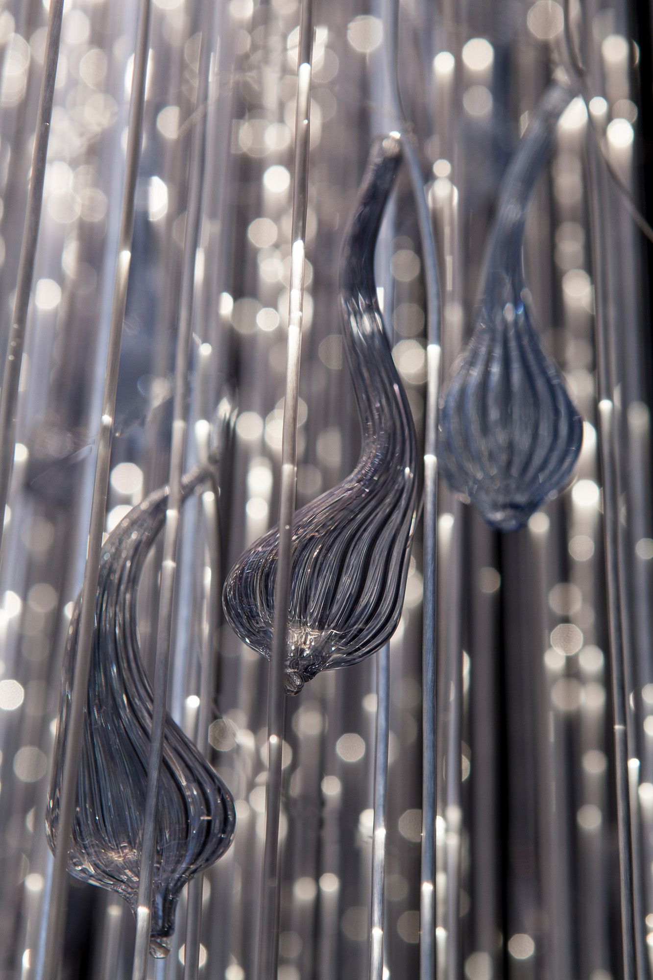 Ø 750mm x H 3000mm Hand blown glass Mirror polished steel Glass side emitting fibres Hand blown glass droplets in iridescent sea blues descend the glass glistening Fibres in constellations that are interspersed between the dazzling pinpoints.