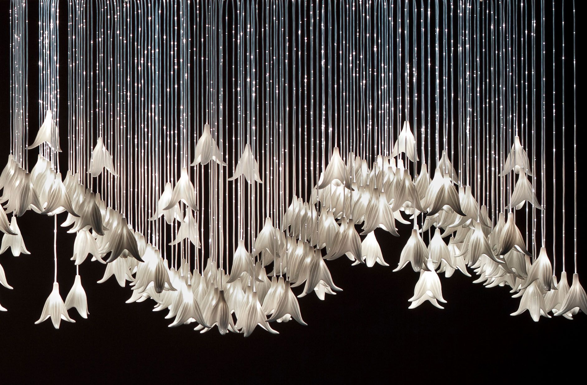 White lucent bone china forms undulate across the sparkling fibres of the light creating a garden of resonating ceramic.
