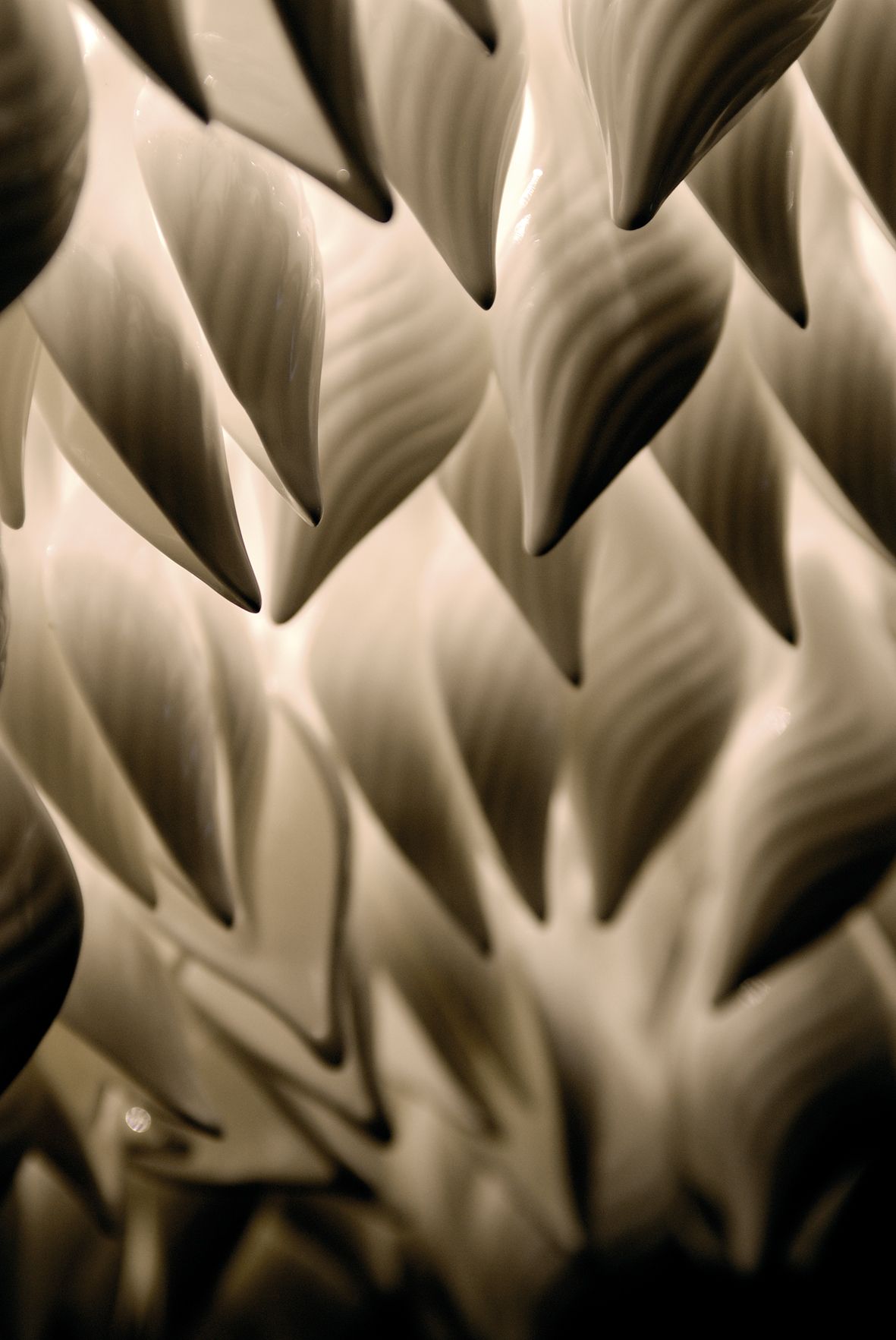 Iona is backlit using golden toned LED capsules and features white lacquered bone china shapes. These tactile, sculptured petal pieces arranged in long flowing strings are gathered in the centre of the piece to create a cascading rosebud formation. The ceramic shapes create a glowing translucent dome shape, their flowing patterned surfaces catching the light.