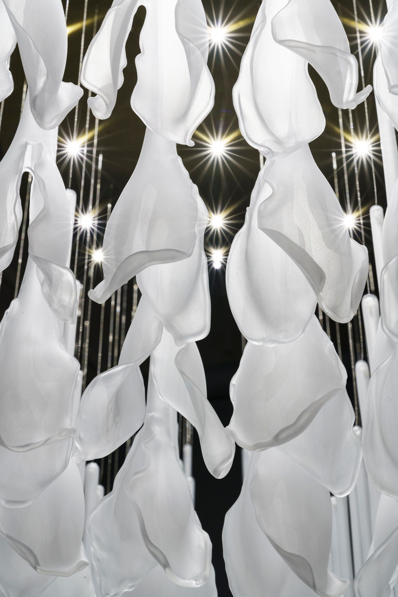 The Lupine Light forms a wave of glistening satin finished brass that is echoed below with stems of tall glass that elegantly flower. This sculptural canopy lends itself to dramatic dining table environments, with the possibility of customising its length, width and drop to suit each space.