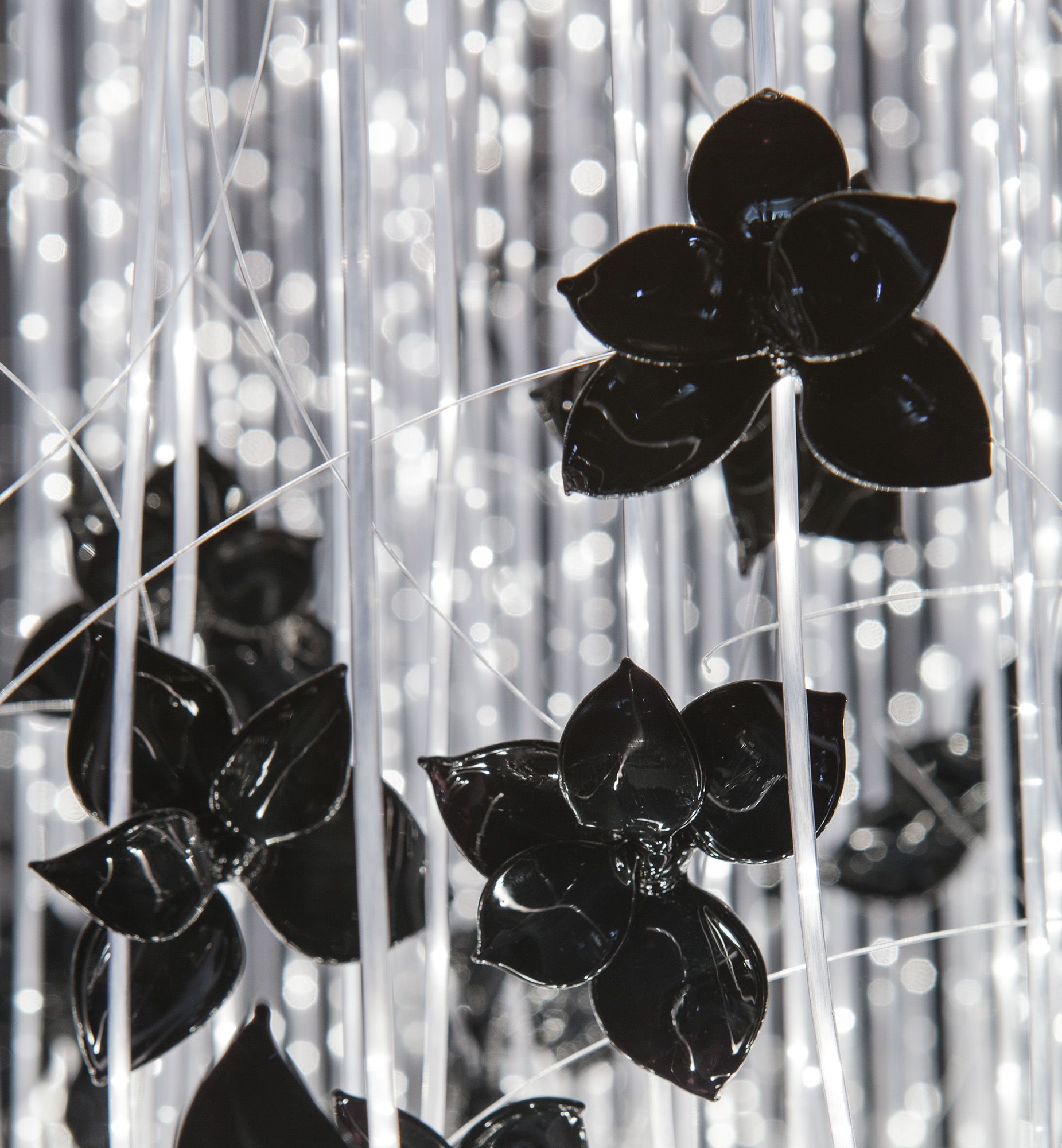Black glass orchids flutter across the ends of the glass fibres, their lustrous opaque finish further emphasizes the delicate bursts of dazzling light.