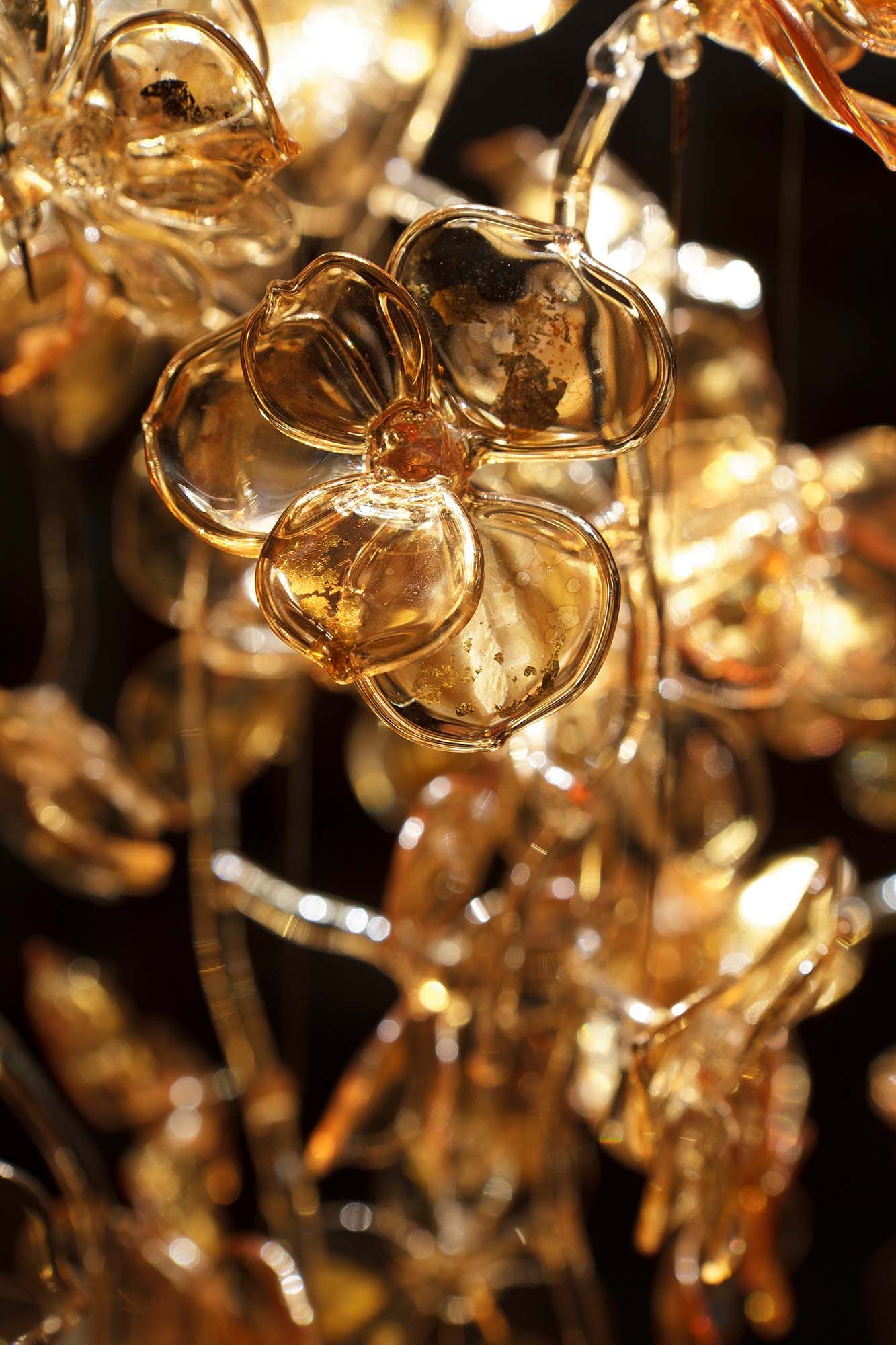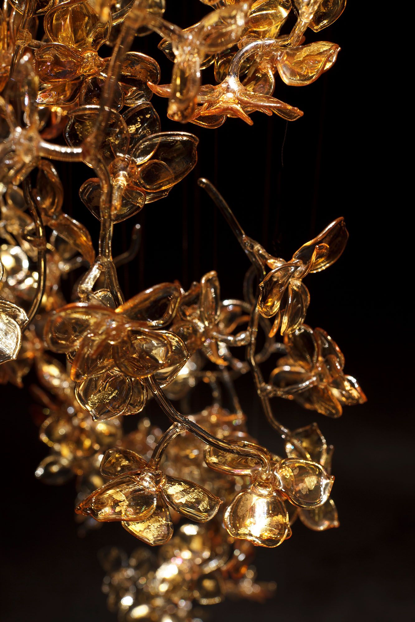 Glass stems budding with amber toned orchids meander elegantly throughout the piece. Speckles of gold leaf captured within the glass glisten under the falling light.